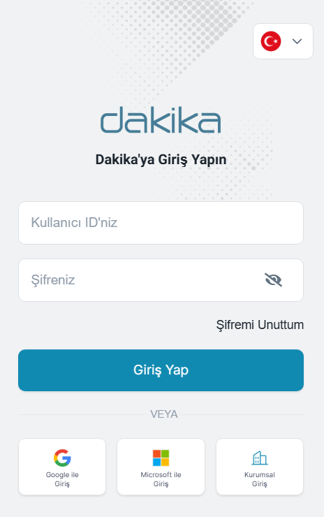 Dakika uygulamasına kullanıcı adı ve şifrenizle veya sistemde kullanıcınızın kayıtlı olduğu Gmail veya Eposta adresinizle Google ile Giriş ve Microsoft ile Giriş seçenekleri ile giriş yapılabilmektedir.