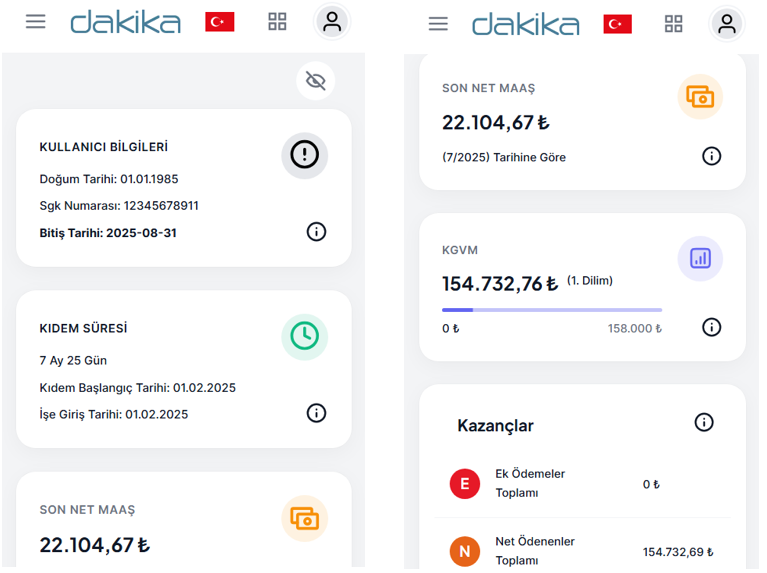 Uygulamaya giriş yaptığınızda sizi bir ana sayfa karşılıyor olacaktır. Bu sayfa üzerinden kendi bilgileriniz, Kıdem Süresi, KGVM ve kazançlar vb. bordro bilgilerinizin görüntülemesini sağlayabilmektesiniz. İlgili sayfada bilgiler gizlenmiş olarak geliyor olacaktır. Ana sayfada üst kısımda bulunan göz ikonuna tıklayarak bilgileri görüntüleyebilmektesiniz.