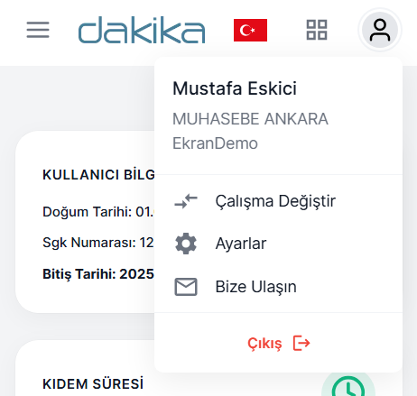 Sağ üst kısımda bulunan profil üzerine tıklayıp Çalışma Değiştir, Ayarlar, Bize Ulaşın ve Çıkış alanlarına ulaşabilmektesiniz.